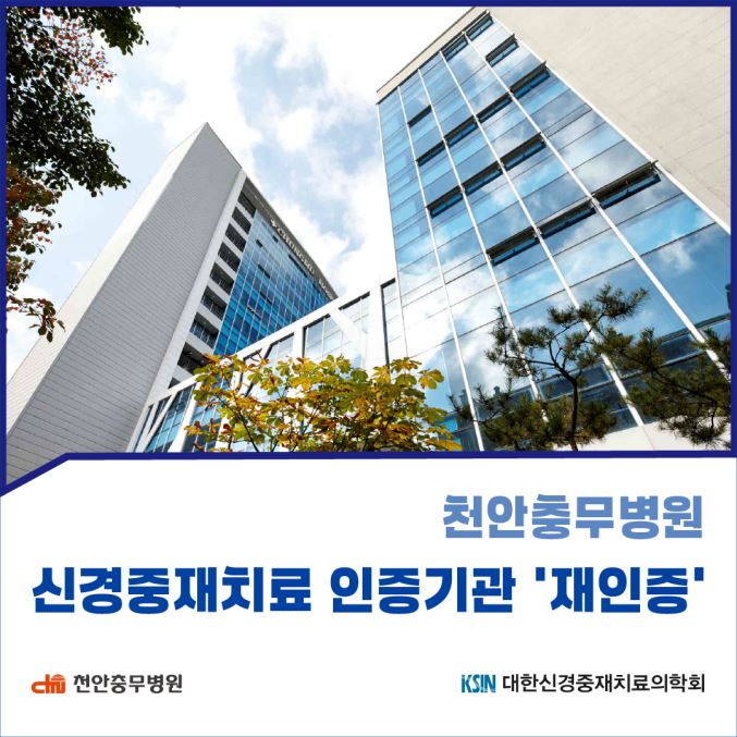 천안충무병원은 지난 2016년 첫 인증에 이어, 2021년 재인증 그리고 올해 다시 한번 재인증을 받으며 신경중재치료 분야의 우수함을 인정받았습니다.
